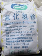 氟化氢铵( 英文名:Ammonium Hydrogen Fluoride)是一种无机化合物,化学式为NH₄HF₂,分子量约57.04。通常呈白色或无色透明正交晶系结晶,片状,略带酸味。相对密度1.50,熔点125.6℃,沸点240℃,折射率1.390。在潮湿空气中易潮解、结块;易溶于冷水,微溶于乙醇;在热水中分解,水溶液呈强酸性;在较高温度下能升华。